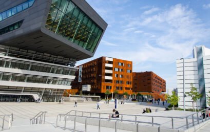 Some People and Students in front of the new and futuristic building of the University of Economics and Business in Vienna.